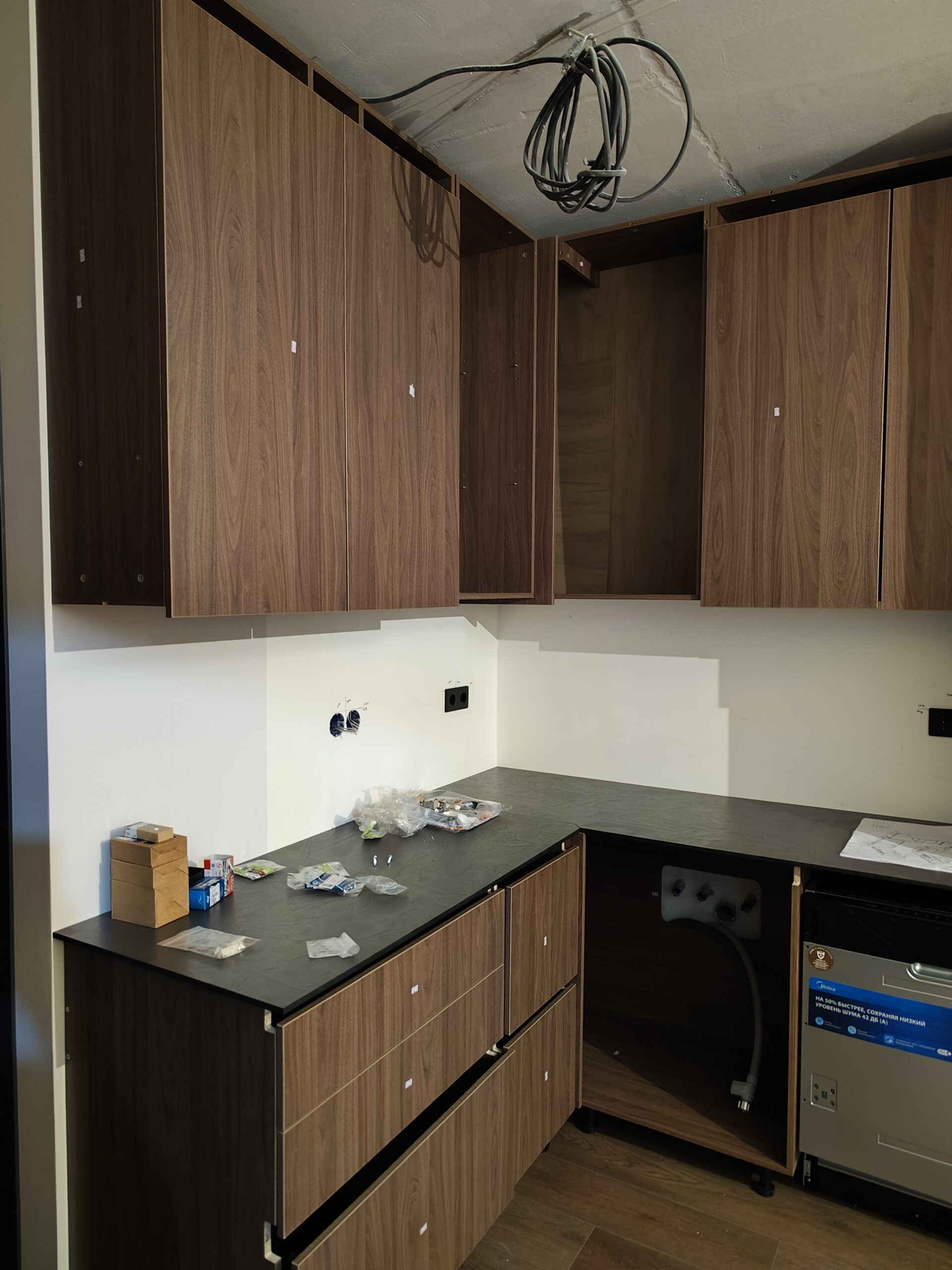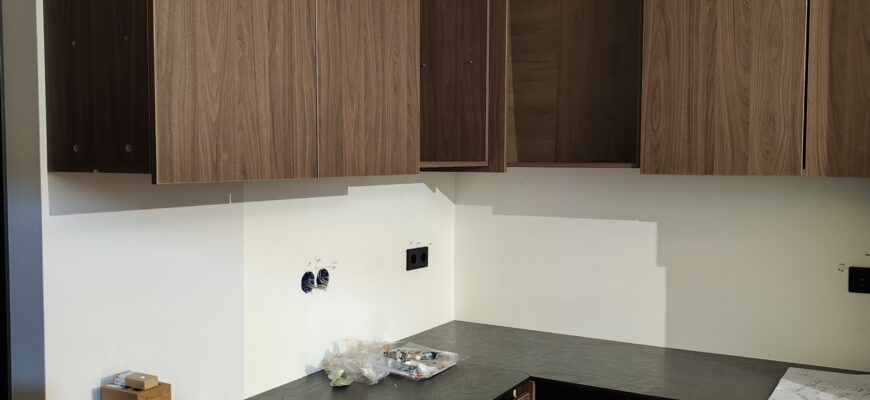 Поступил предновогодний заказ на сборку кухни. Наша команда изыскала возможность помочь молодой семье в этом, чтобы новогодние праздники были проведены в более уютной обстановке. Корпус и фасады из ЛДСП Egger. Чувствуется разница в работе с качественным материалом. Интересный метод использования разной фурнитуры. HPL плита. Очень аккуратный заводской выпил под коммуникации. На фото этап работы до выравнивания второго ряда шкафов.